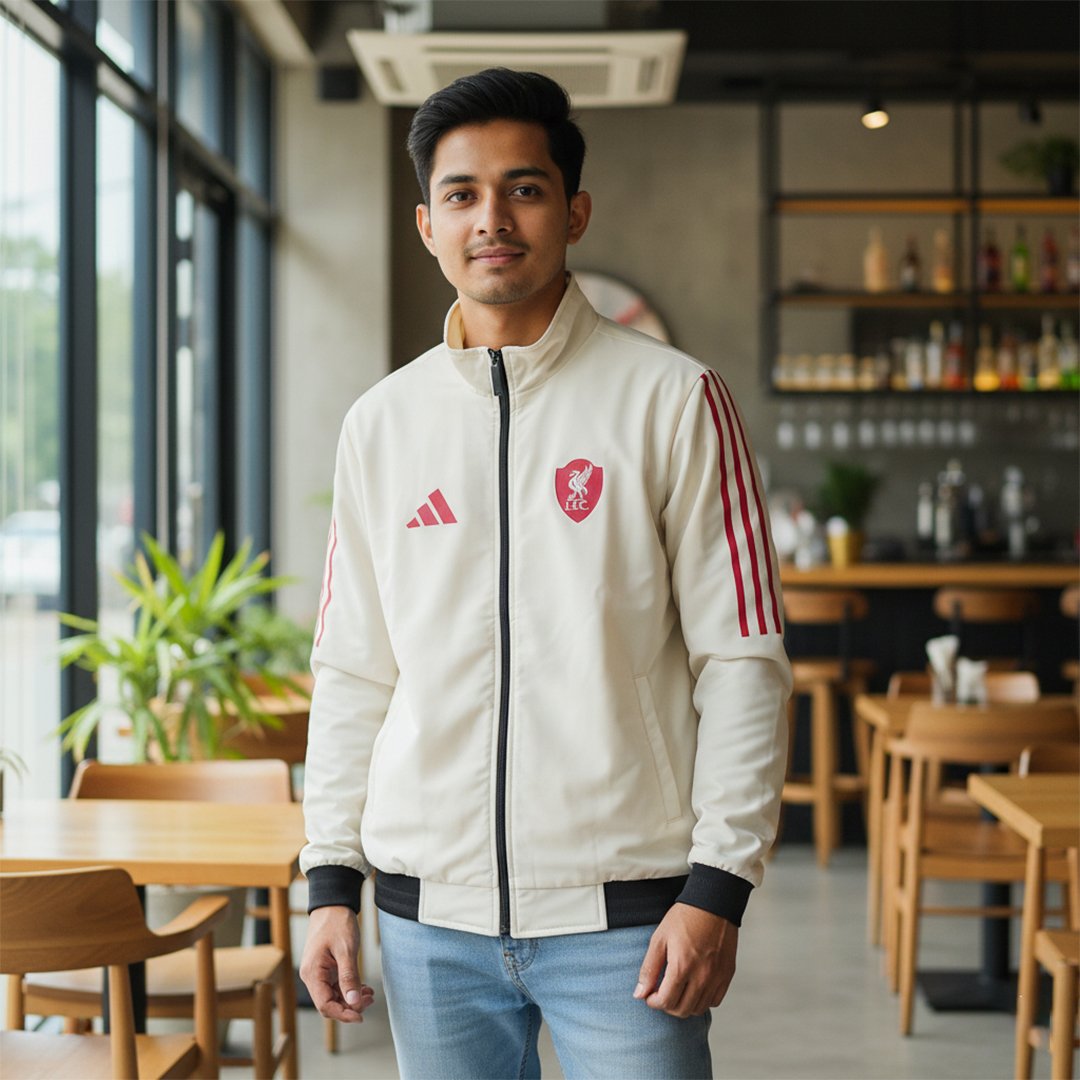 FC Liverpool ক্লাবের ২০২৫-২৬ সিজনের Away Kit থেকে অনুপ্রেরণা নিয়ে জ্যাকেটটি তৈরি করা হয়েছে। অফ হোয়াইট ফ্যাব্রিকের উপর লাল রঙের ডেনিম প্রিন্ট করা হয়েছে।