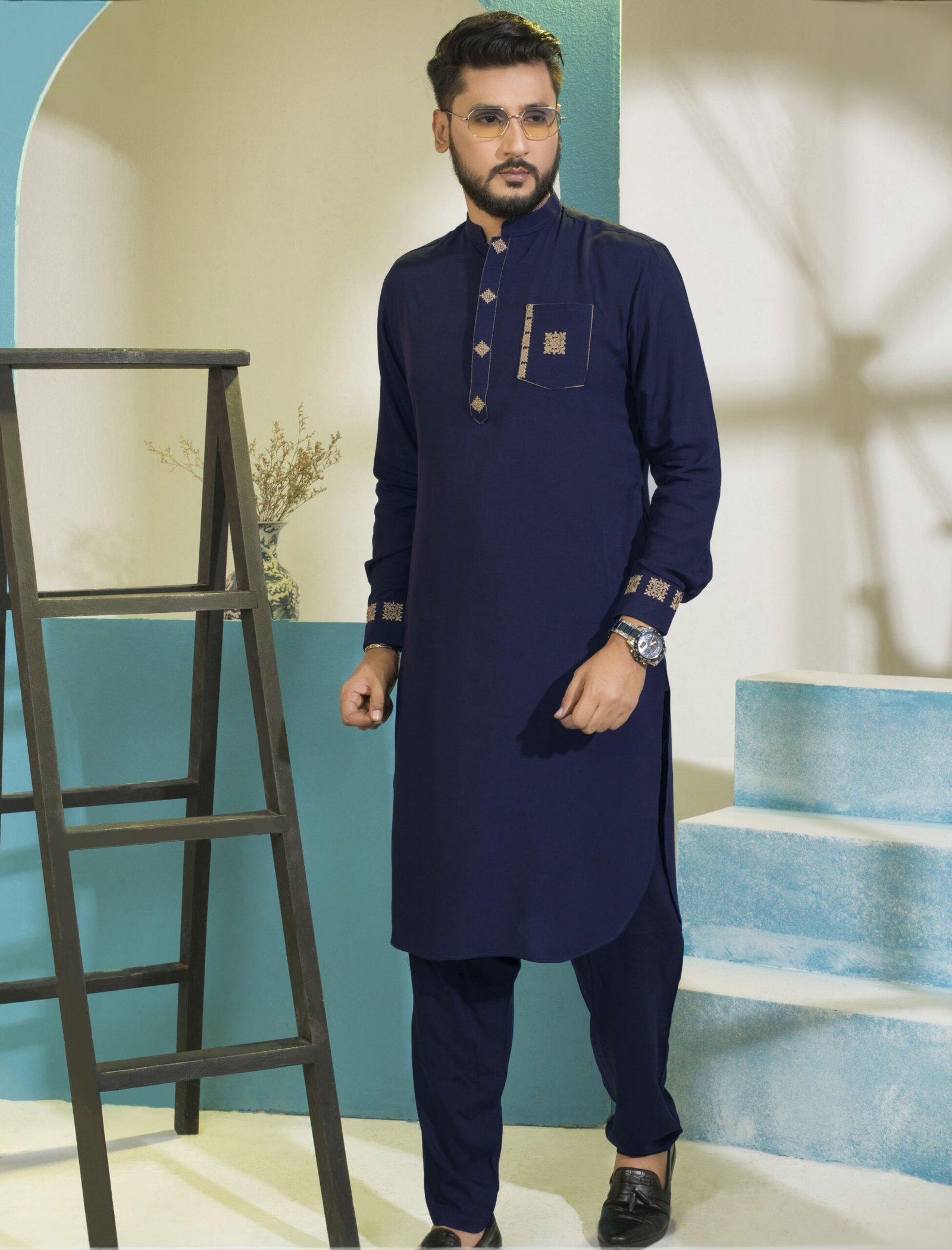 Navy Blue Color Embroidery Kabli Set