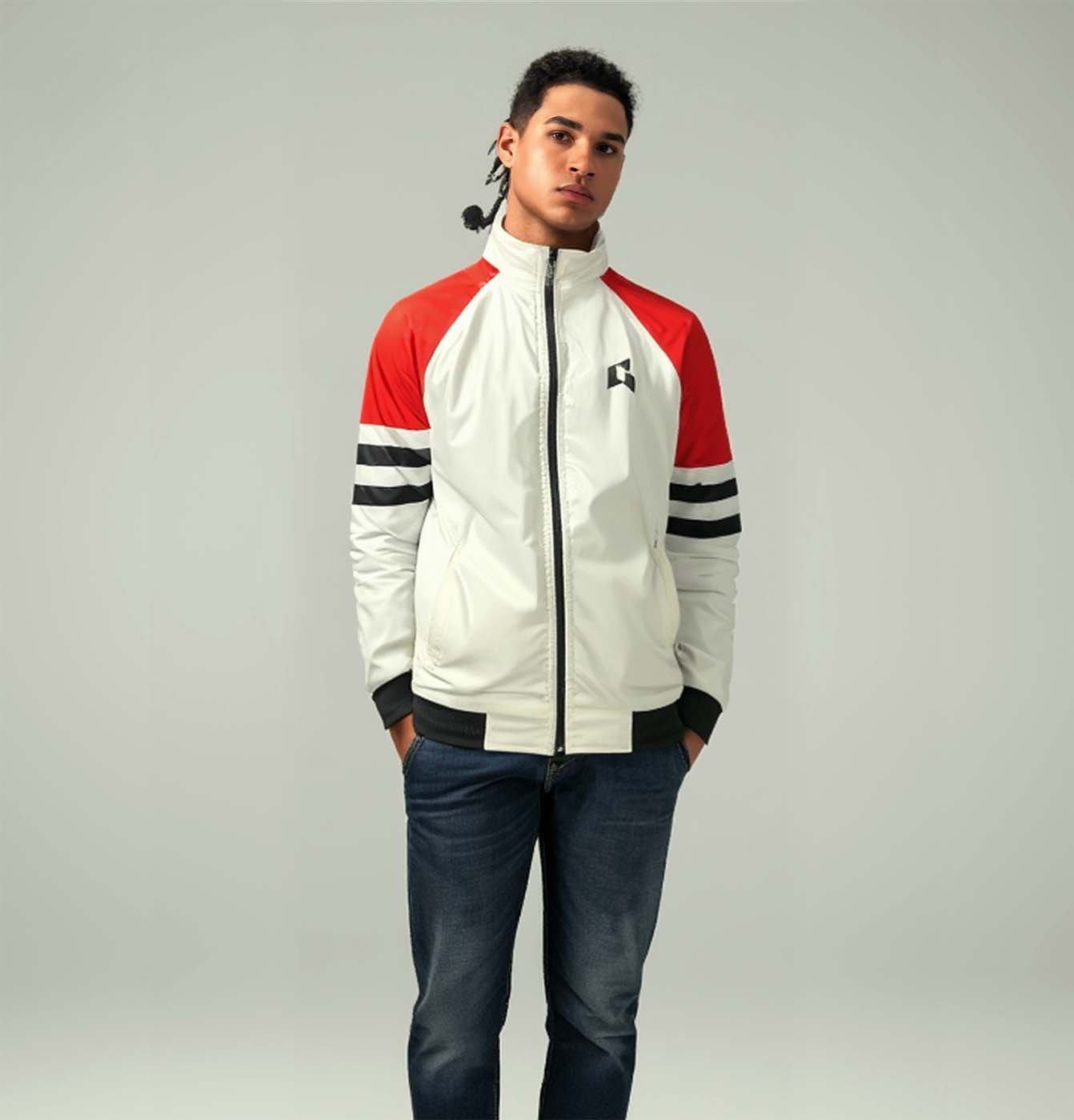 সাদা ও লাল ফ্যাব্রিকের কম্বিনেশনে রেগ্লান ডিজাইনে জ্যাকেটটি তৈরি করা হয়েছে। বুকের বাম পাশে এবং হাতায় কালো রঙের ডেনিম প্রিন্ট করা হয়েছে।